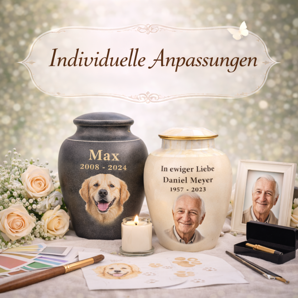 Jede Tierurne kann individuell personalisiert werden – mit Namen, Daten, Widmung, Pfotenabdruck oder Wunschmotiv. So entsteht ein bleibender Ort der Erinnerung.